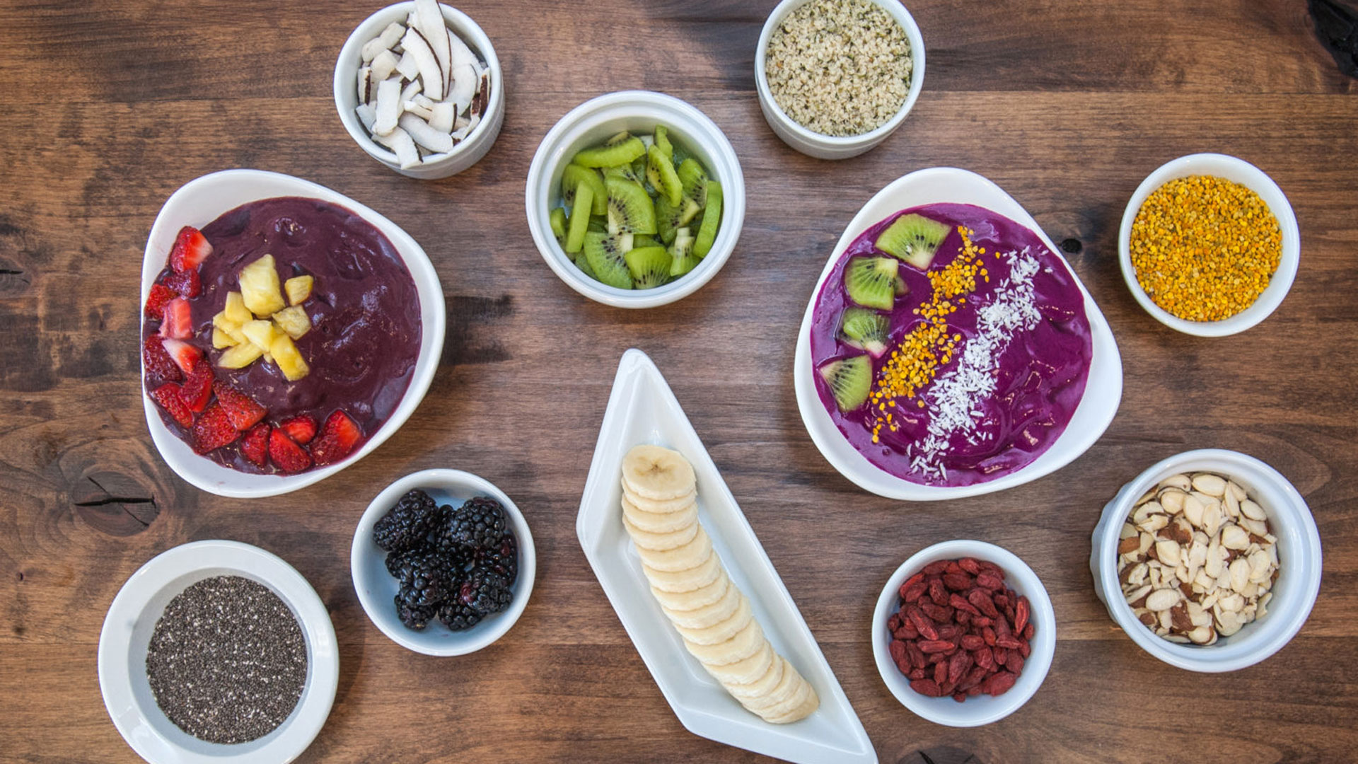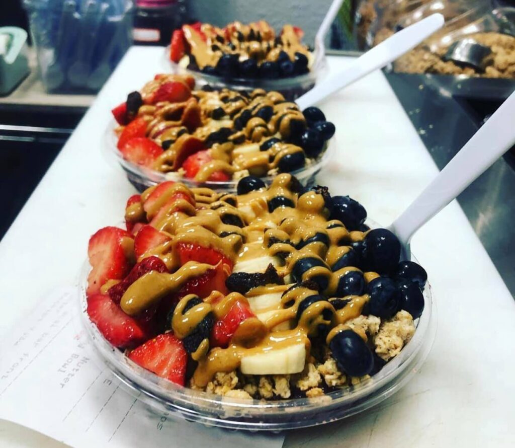 Inspired by Brazilian tradition and by the laid back lifestyle and the healthy breakfast & lunch alternatives in Southern California, we introduce you to the mega superfood known as the açaí berry. Some studies show that açaí fruit pulp is even richer in antioxidants than cranberries, raspberries, blackberries, strawberries, or blueberries. The base and foundation of the Açaí Bar Bowl consists of the Açaí berry blended with all-natural fruit to a thick creamy consistency, topped with organic granola, honey, and other super-foods custom-made to your liking. Simply put, it’s your custom “smoothie in a bowl”. The Açaí Bar sources all fresh ingredients so you can be sure that you are eating clean. All bowls are topped with a variety of the freshest fruit, honey, granola, and organic coconut shreds.